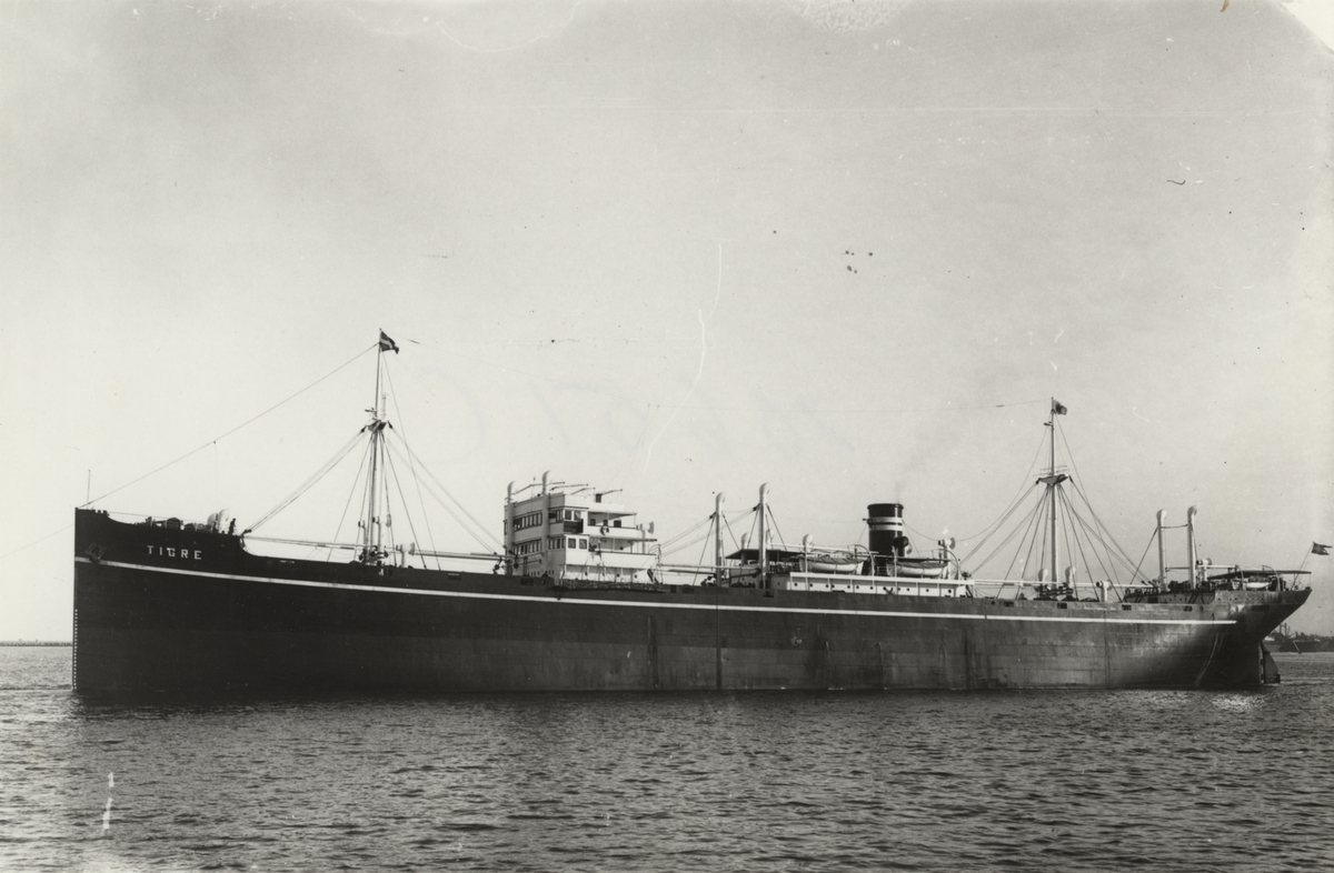 Foto i svartvitt visande lastmotorfartyget "TIGRE" av Tönsberg i Köpenhamn troligen 1930-talet.