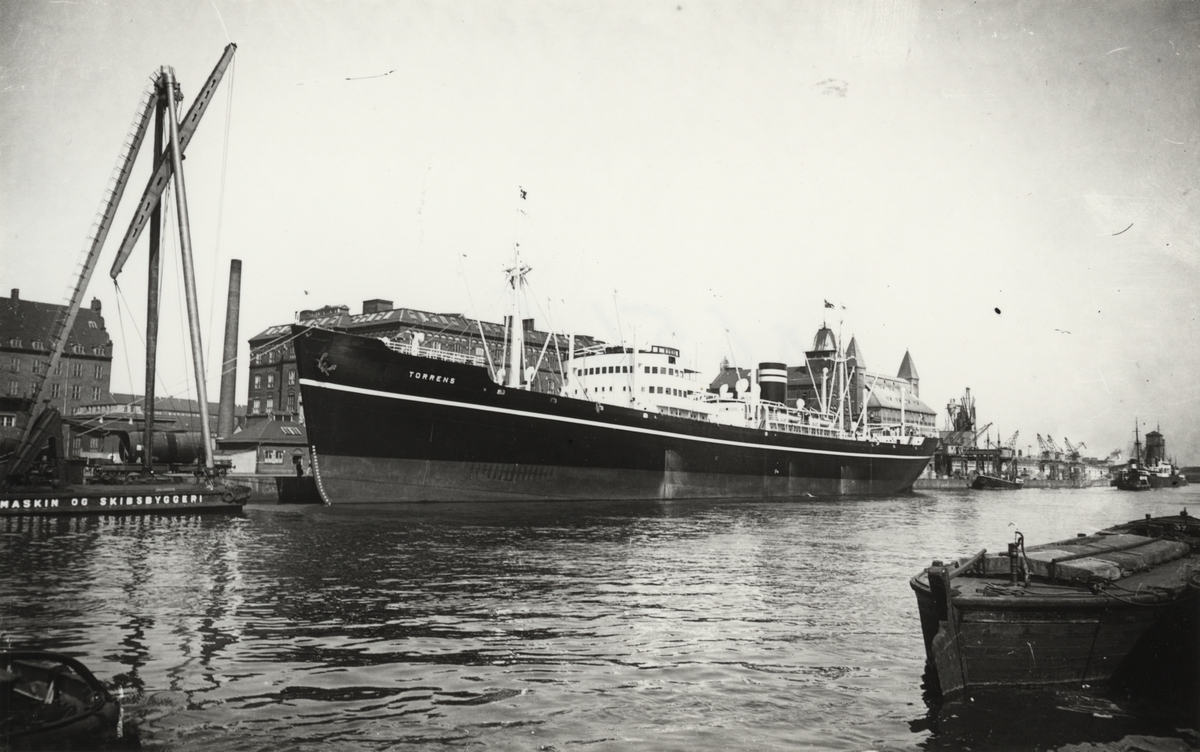 Titel: Foto i svartvitt visande lastmotorfartyget "TORRENS" av Tönsberg vid kaj i Köpenhamn, troligen på 1940-talet.