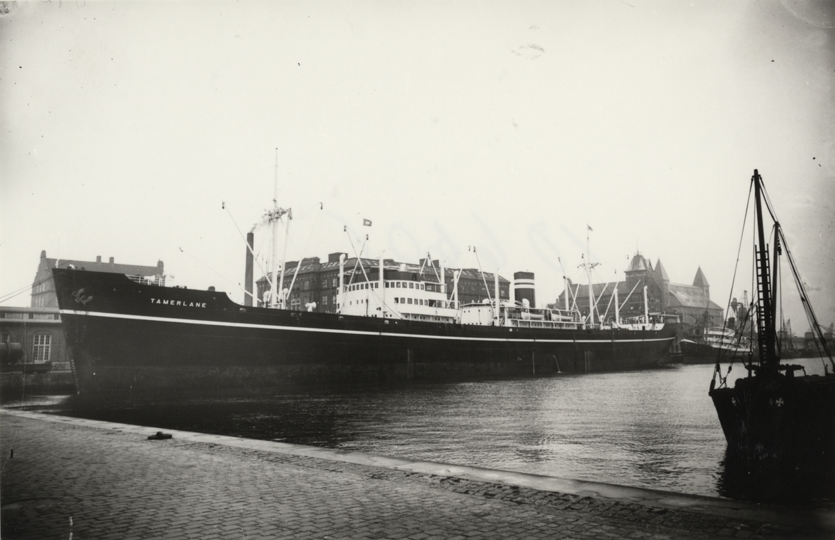 Foto i svartvitt visande lastmotorfartyget "TAMERLANE" av Tönsberg vid kaj i Köpenhamn, senare hälften av 1930-talet.