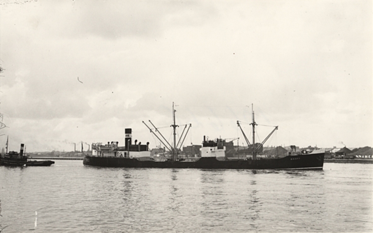 Foto i svartvitt visande lastångfartyget "BROTT" av Oslo i Köpenhamn i slutet av 1930-talet.