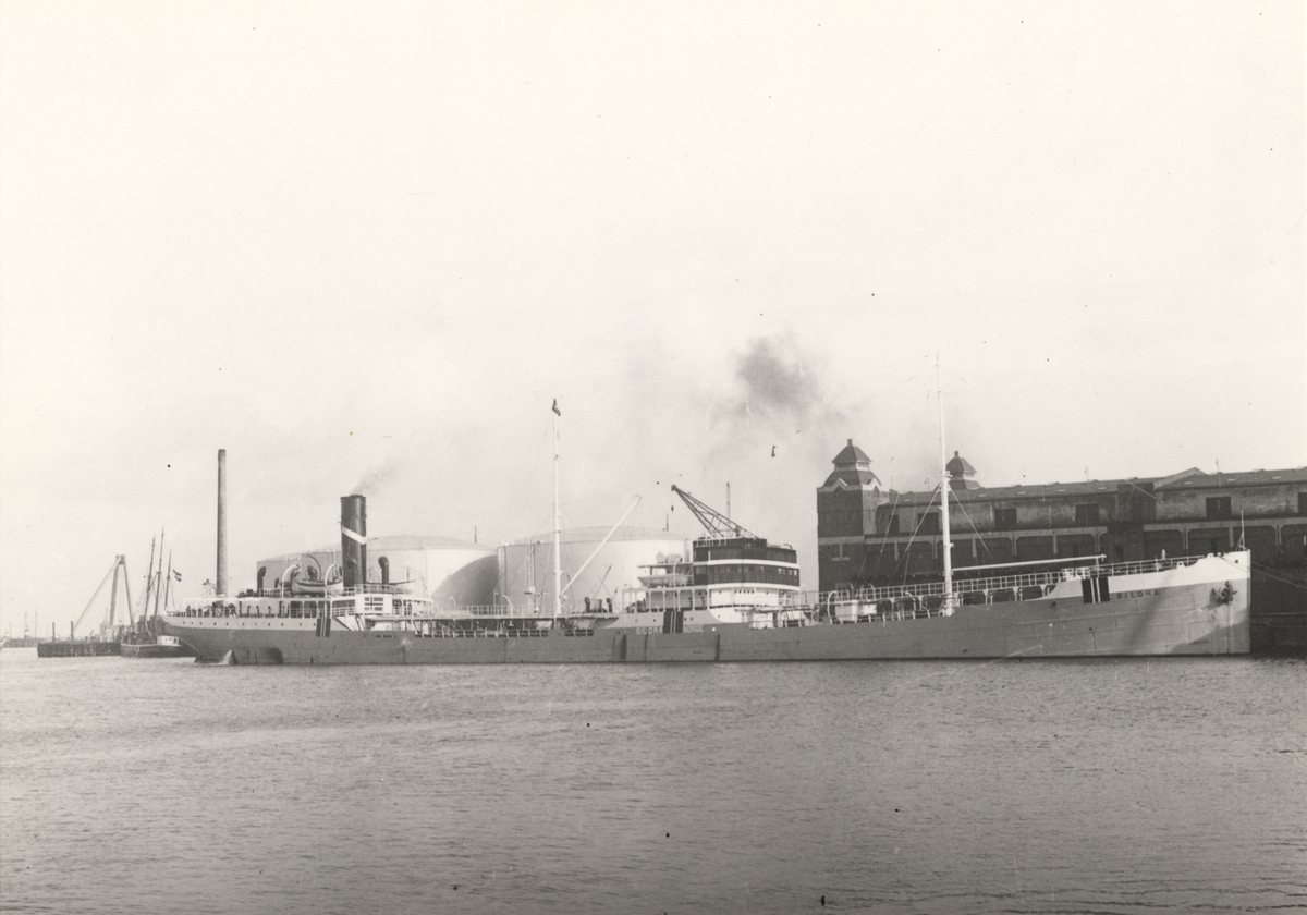 Titel: Foto i svartvitt visande tankmotorfartyget "SILDRA" av Bergen vid kaj i Köpenhamn 1939-41.