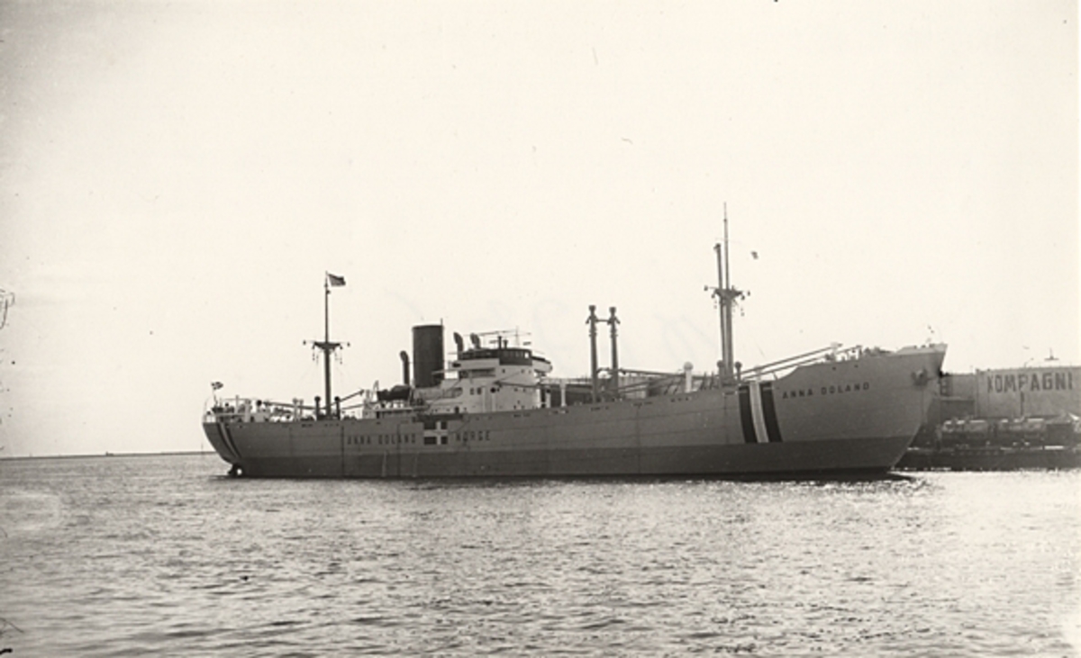 Foto i svartvitt visande lastmotorfartyget "ANNA ODLAND" av Haugesund vid kaj i Köpenhamn under 1939 - 1940-talet.