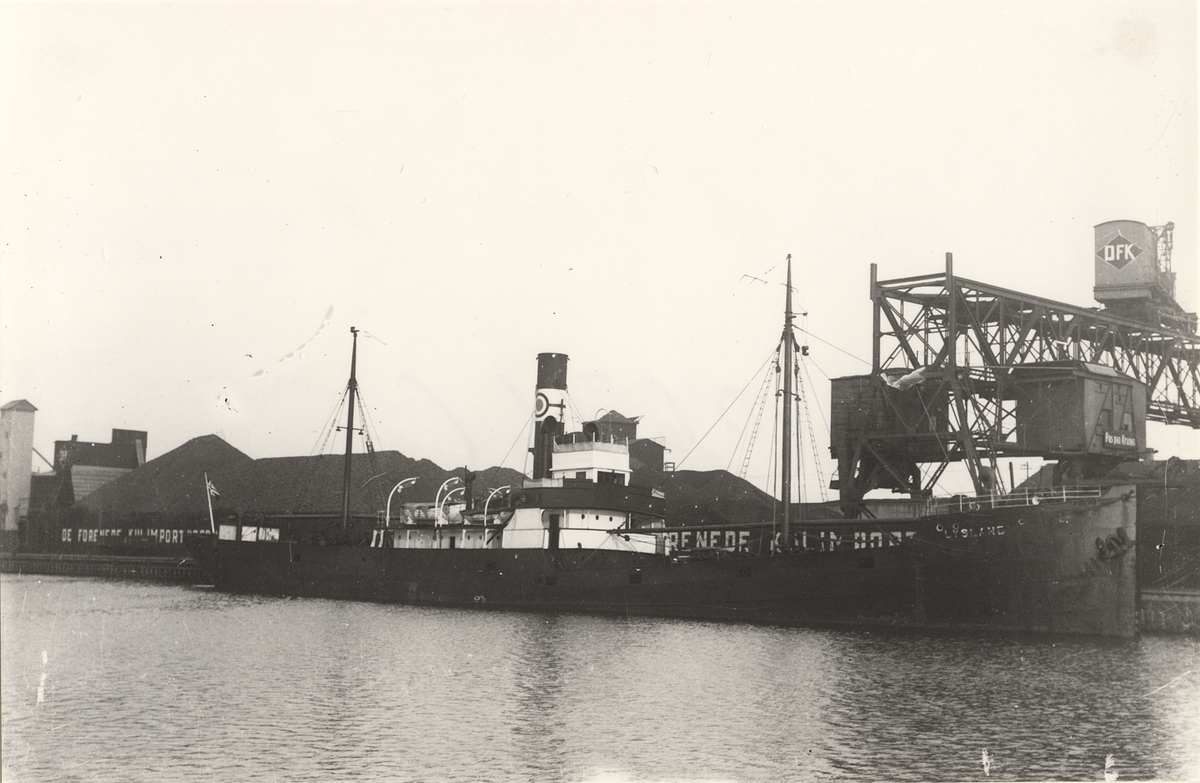 Foto i svartvitt visande lastångfartyget "LYSLAND" av Bergen vid kaj i Köpenhamn under 1930-talet.