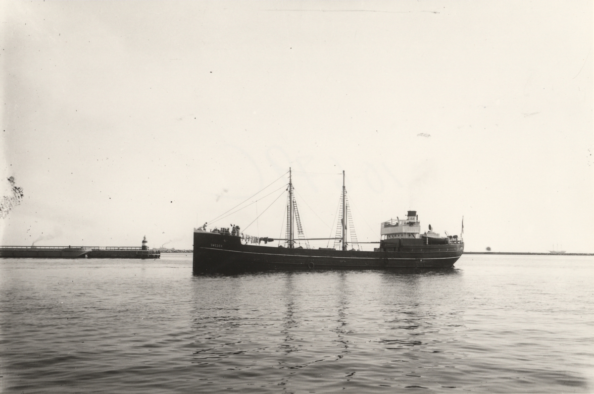 Foto i svartvitt visande lastmotorfartyget "SWEDEN" av Mariehamn i Köpenhamn under 1930-talet.