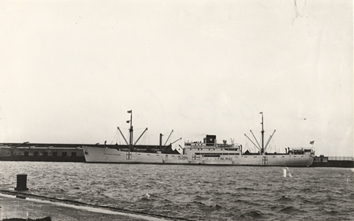 Foto i svartvitt visande lastmotorfartyget "CAROLINA THORDÉN" av Helsingfors vid kaj i Köpenhamn 1939 - 1940-talet.