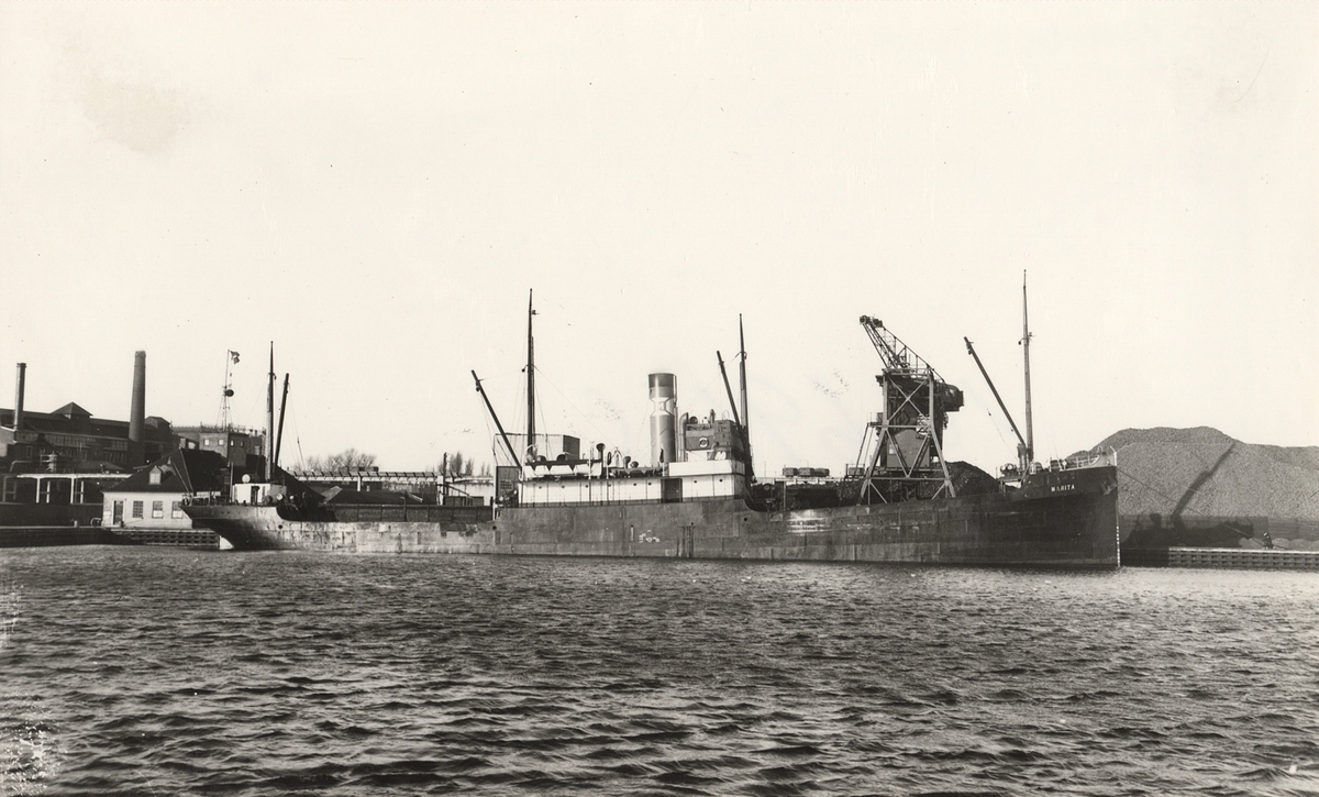 Foto isvartvitt visande lastångfartyget "MARITA" av Kotka vid kaj i Köpenhamn, slutet av 1930-talet.