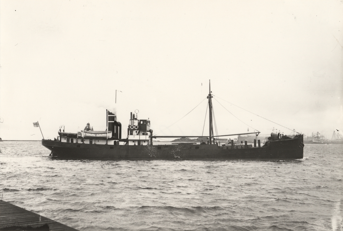 Foto i svartvitt visande lastångfartyget "PATRIA" av Helsingfors i Köpenhamn under 1930-talet.
