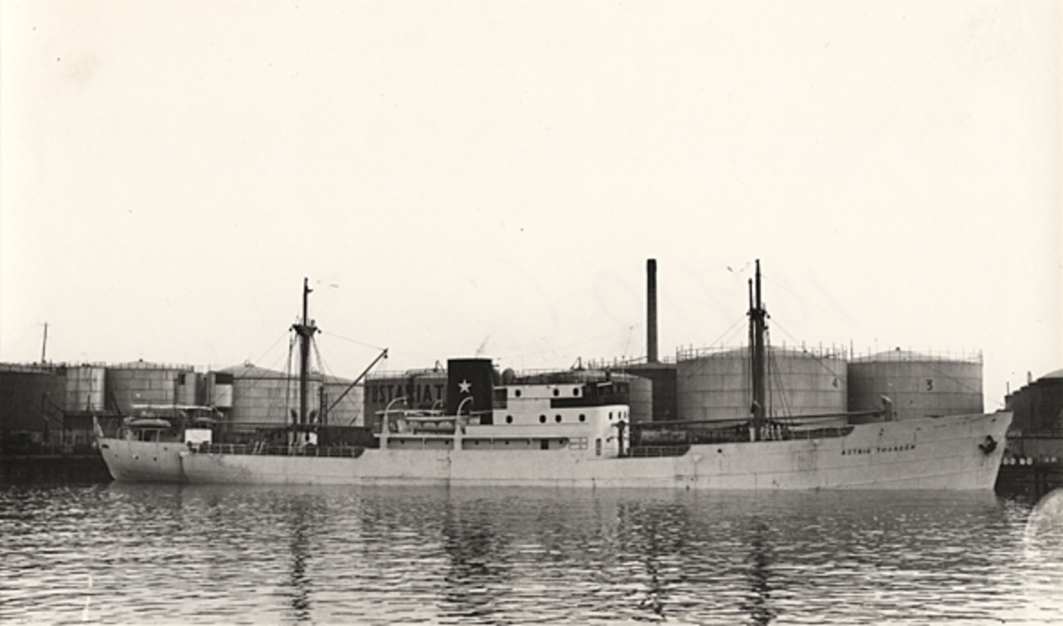 Foto i svartvitt visande lastmotorfartyget "ASTRID THORDÉN" av Helsingfors i Köpenhamn vid slutet av 1930-talet.
