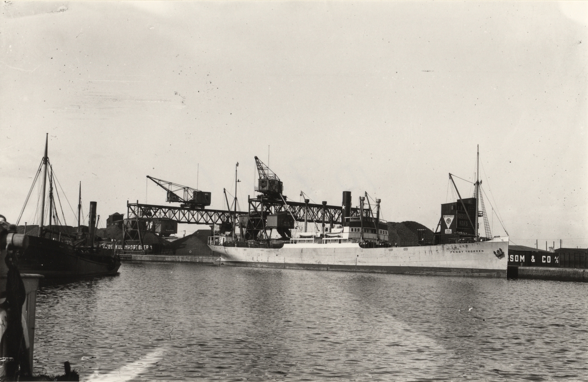 Foto i svartvitt visande lastångfartyet "PEGGY THORDÉN" av Helsingfors vid kaj i Köpenhamn, slutet av 1930-talet.