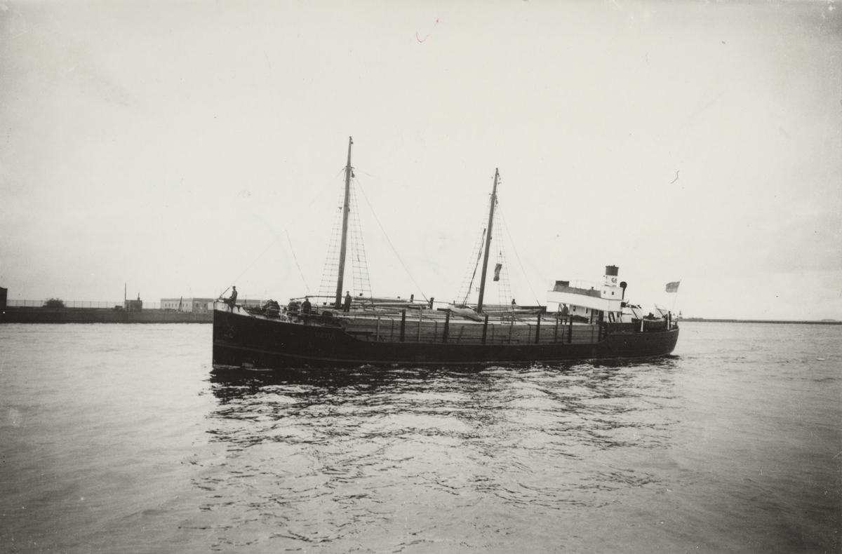 Foto i svartvitt visande lastmotorfartyget "VERA" av Mariehamn i Köpenhamn, 1930-talet.