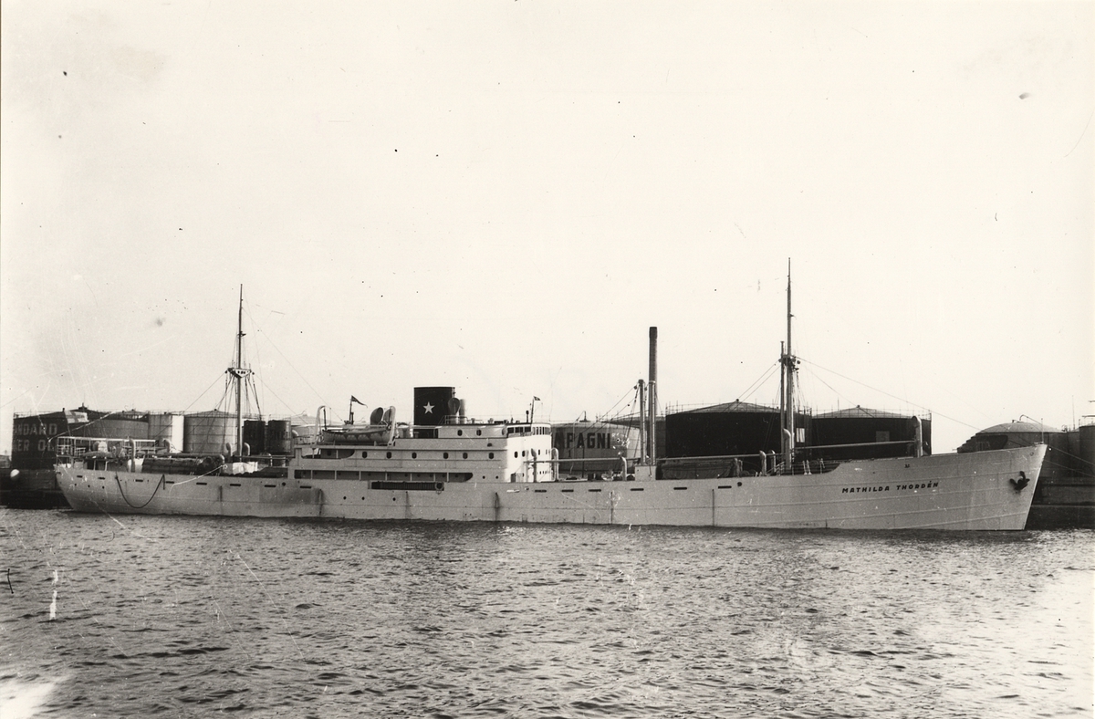Foto i svartvitt visande lastmotorfartyget "MATHILDA THORDÉN" av Helsingfors vid kaj i Köpenhamn 1938-40.