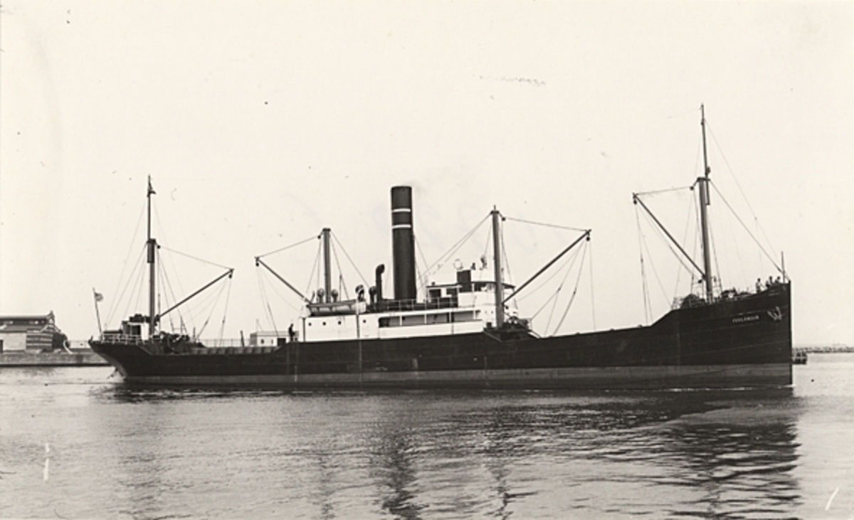 Foto i svartvitt visande lastångfartyet "FINLANDIA" av Helsingfors i Köpenhamn under 1930-talet.