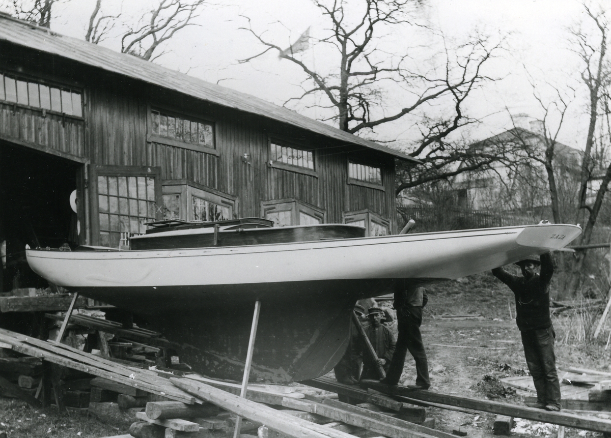 Segelbåten ZAZA, byggd 1901 på Mälarvarvet efter Hugo Schuberts ritningar. Här första sjösättningen. Första ägaren E. Mattsson.