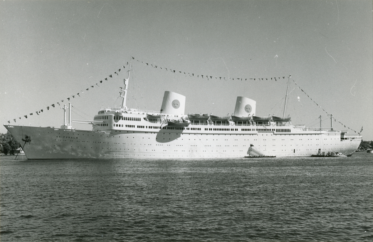 Foto visande passagerarfartyget GRIPSHOLM av Göteborg till ankars på Stockholm ström år 1963.