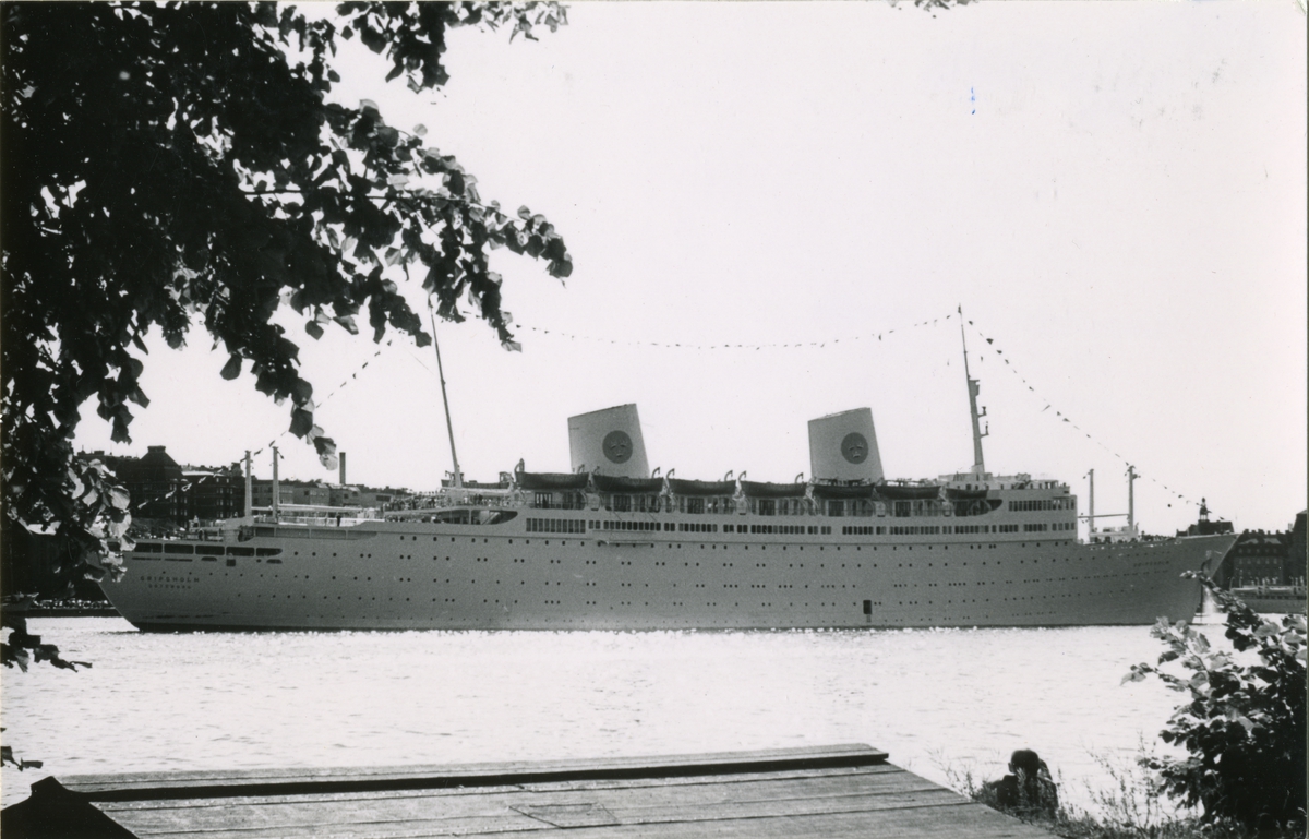 Foto föreställande passagerarfartyget GRIPSHOLM av Göteborg till ankars i Stockholms ström år 1959.