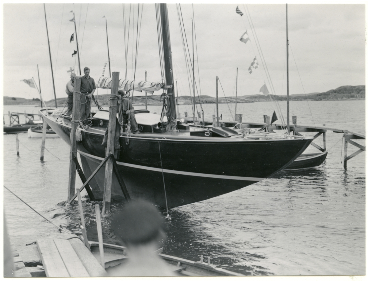 [från fotobeskrivningen:] "Sjösättning av 8 m ÖR-jacht GULLVEIG I vid Arendals båtbarv 1943 i augusti."