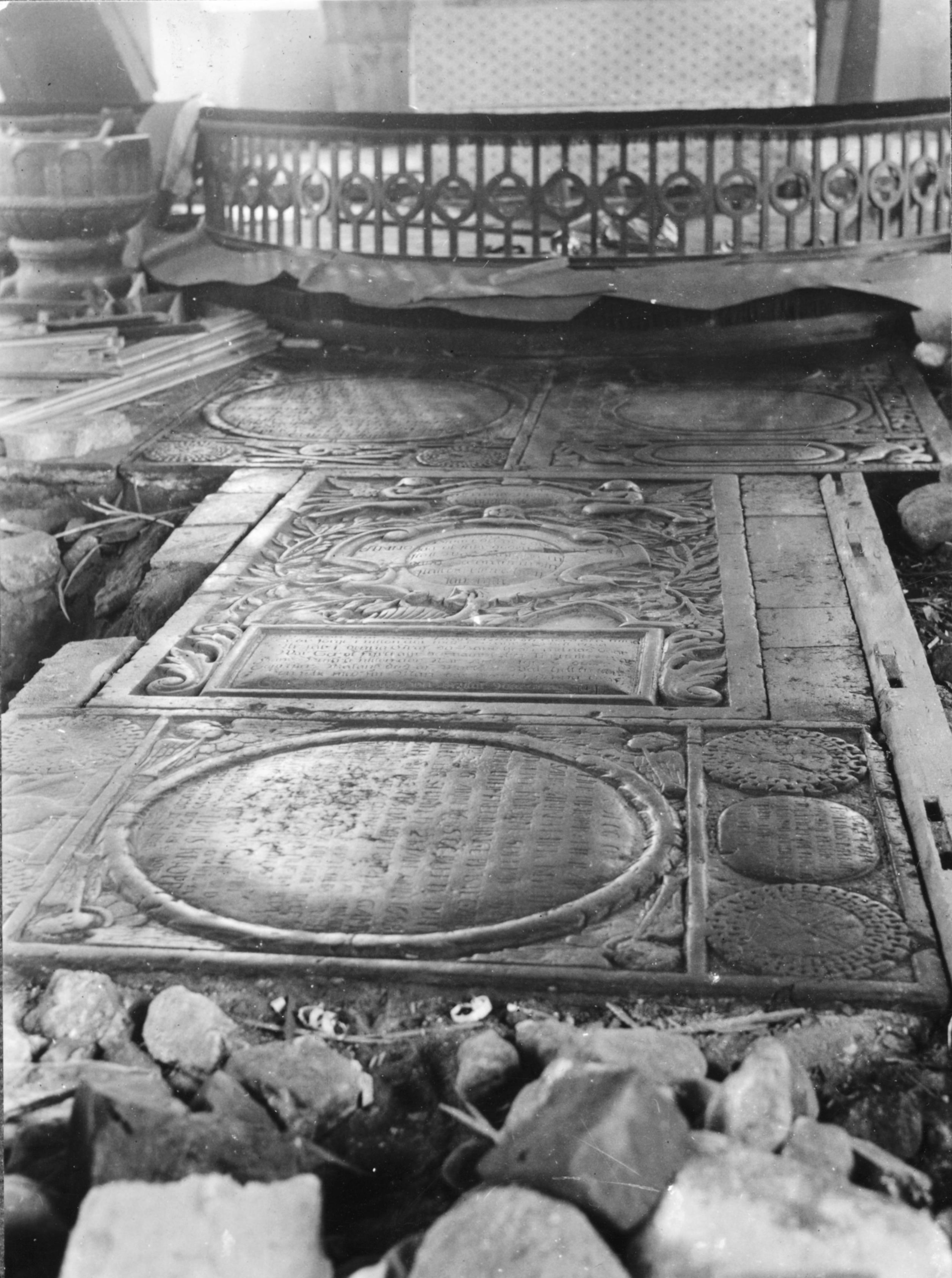 Fyra av de ståtligaste gravhällarna i långhuset. Foto åt öster.
