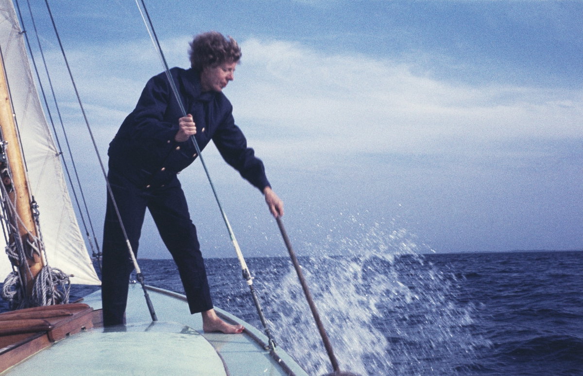Karin Palmér borstar däcket på sin folkbåt F-S133 KARP.