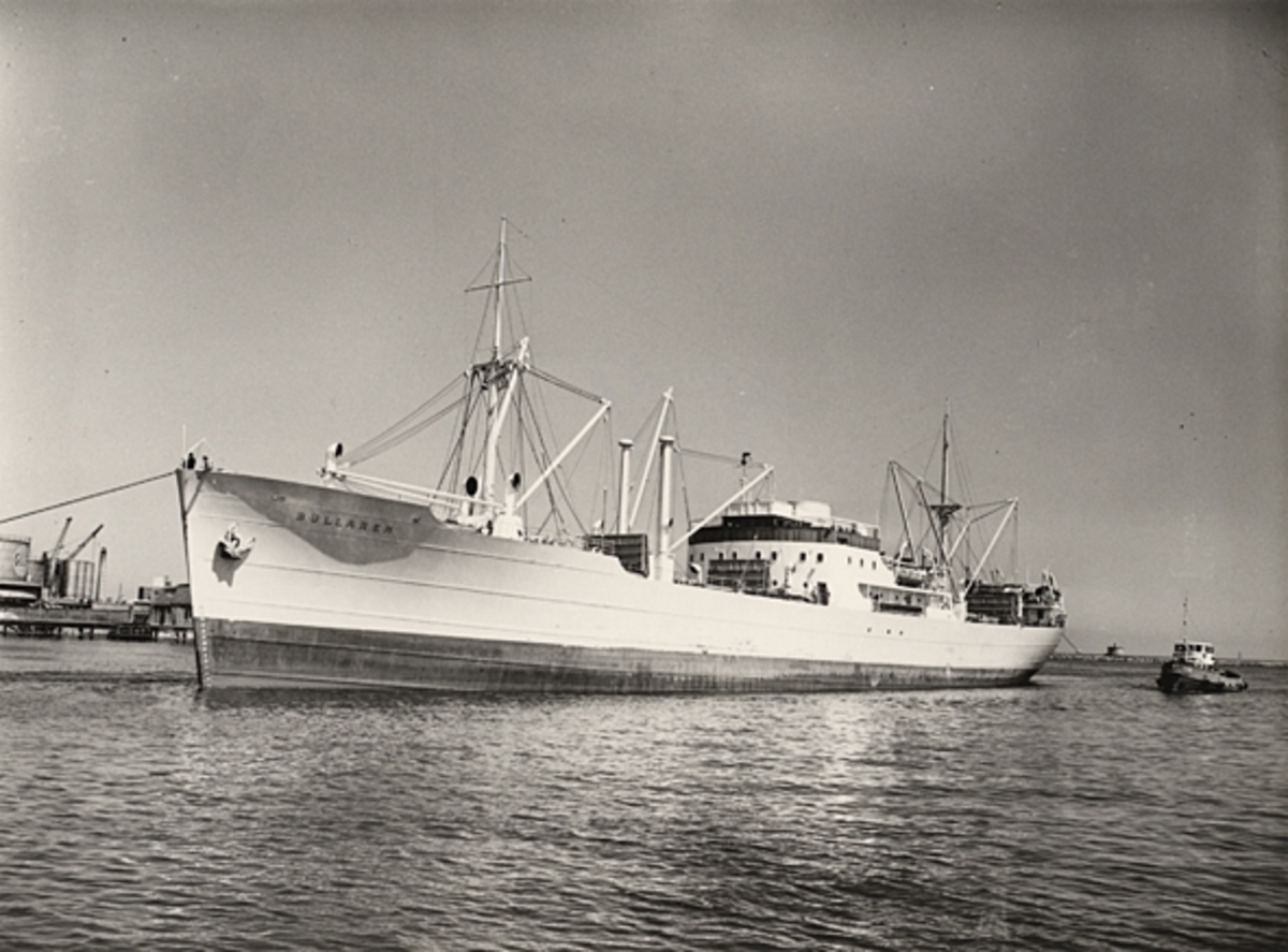 Foto i svartvitt visande lastmotorfartyget "BULLAREN" i Köpenhamn 22.6.1960.