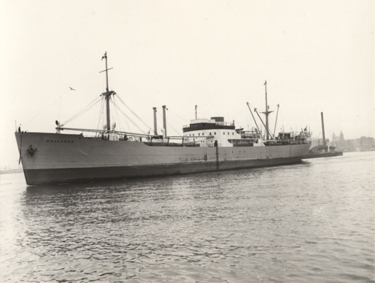 Foto i svartvitt visande lastmotorfartyget "BULLAREN" i Köpenhamn den 8.1.1955.