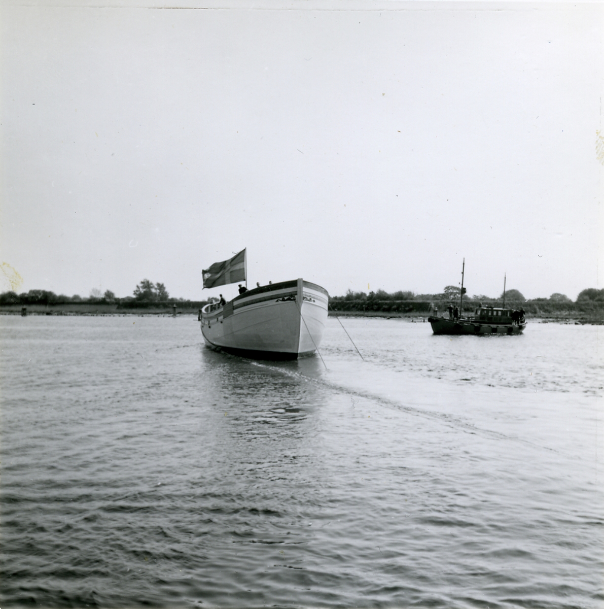 Ankartrossen stramas upp. Lotsbåten som skall bogsera SVERIGE till utrustningskajen, närmare sig.