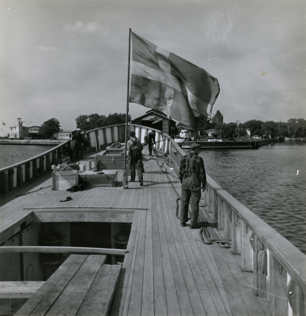 Medan flaggan slår ut för vinden passas ankartrossarna, som löper överbord.