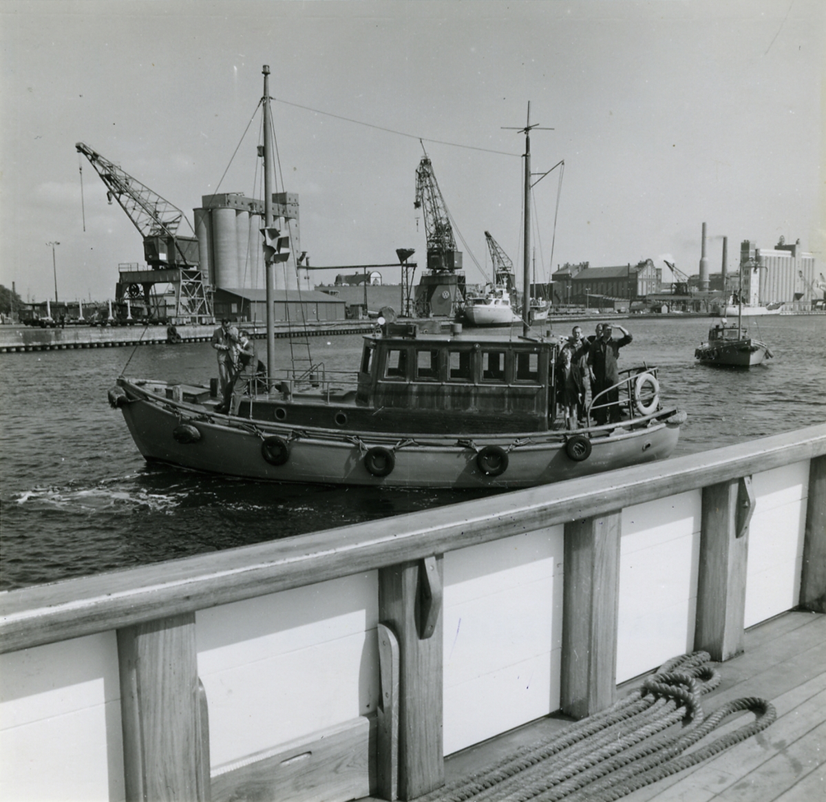Lotsbåten som skall bogsera SVERIGE in till utrustningskajen. Bilden tagen från däck på SVERIGE.