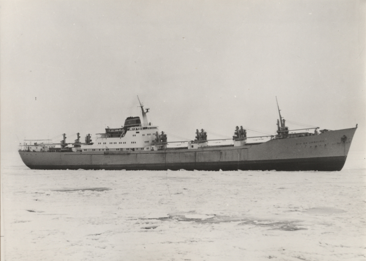 Lastmotorfartyget RIO DE JANEIRO av Stockholm i Öresundsisen 1963. Fartyget tager 12 passagerare.