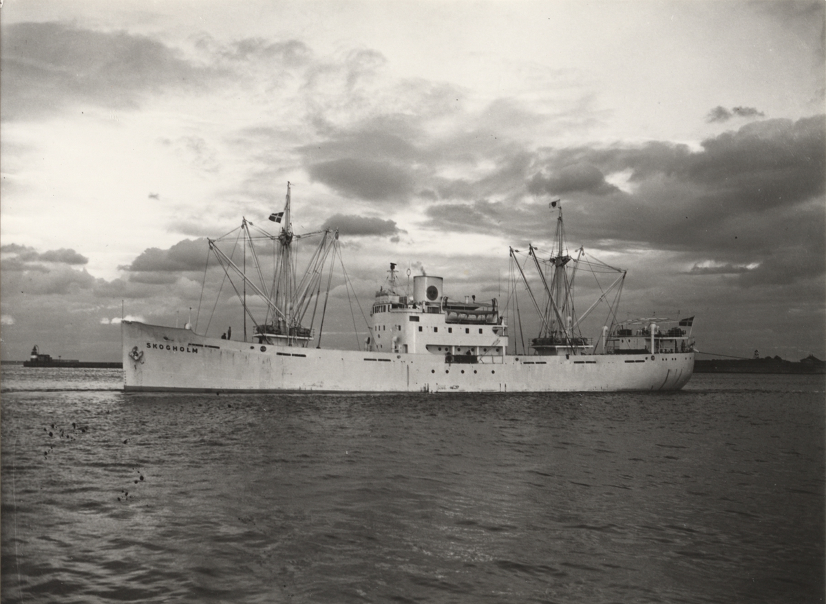 Foto i svartvitt visande lastmotorfartyget "SKOGHOLM" taget i Köpenhamn under år 1955.