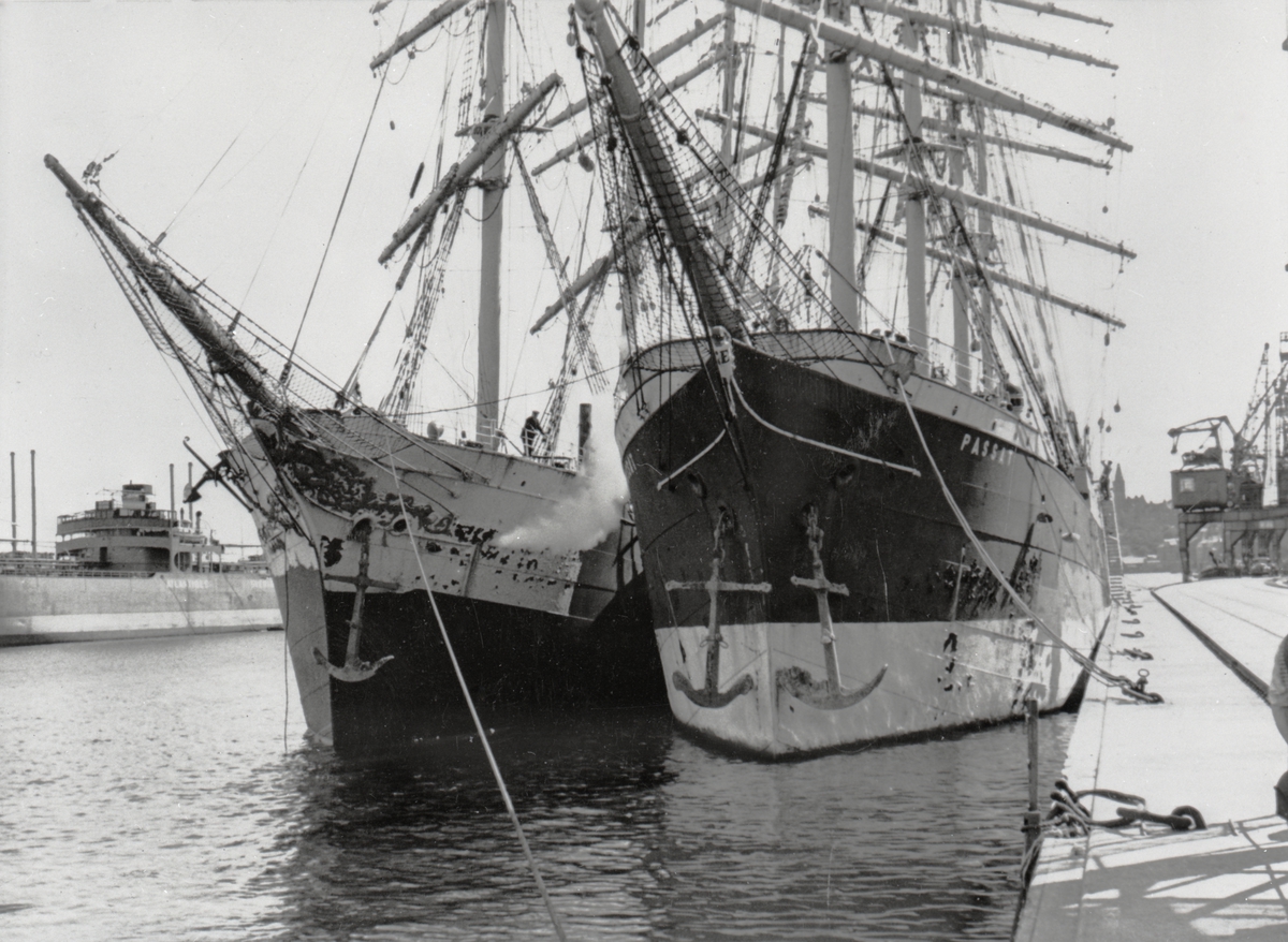 [från fotobeskrivningen:] "4-mast barkarna VIKING och PASSAT av Mariehamn liggande i Sthlm. Foto från 1940-talet..." [---]