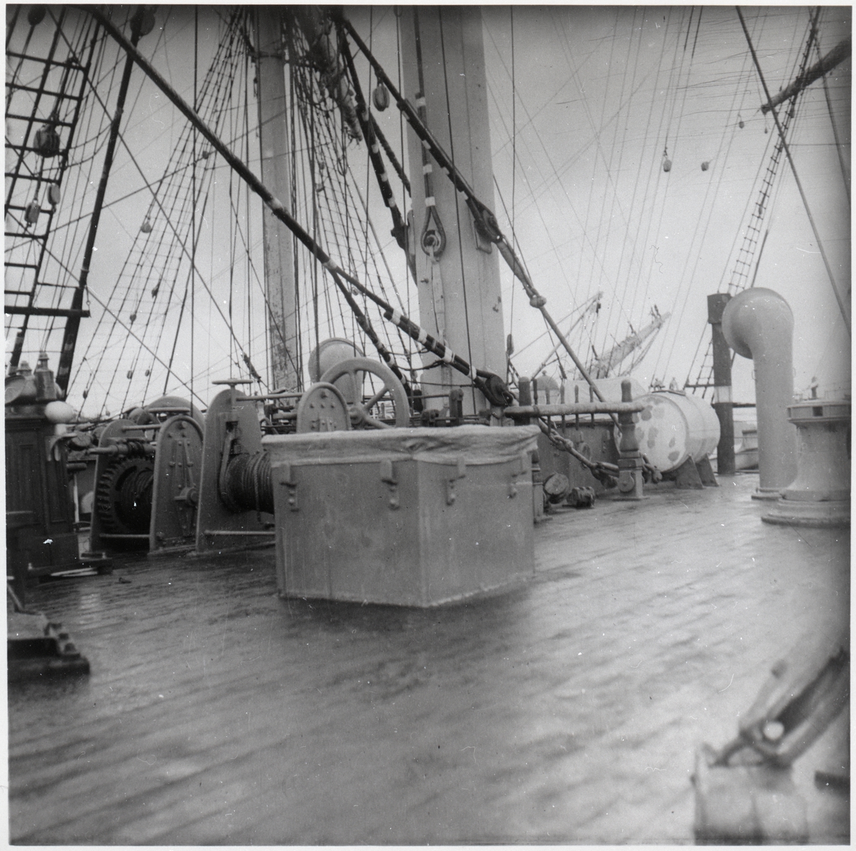 [från fotobeskrivningen:] "4-mast barken PASSAT av Mariehamn liggande i Sthlm juli 1944. Vy av däcket med stormasten. Längst t. v. nakterhuset." [---]
