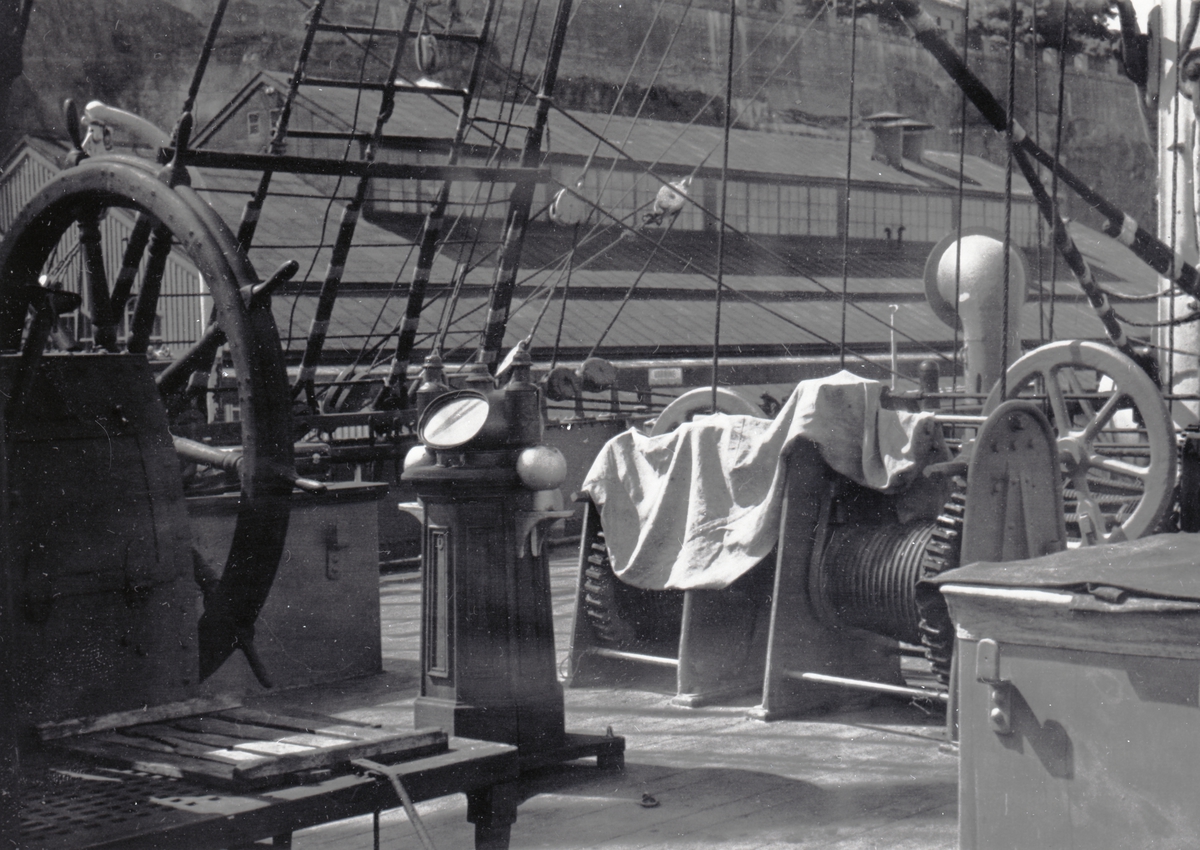 [från fotobeskrivningen:] "4-mast barken PASSAT av Mariehamn. Däcksbild akter om stormasten. Foto 1944." [---]