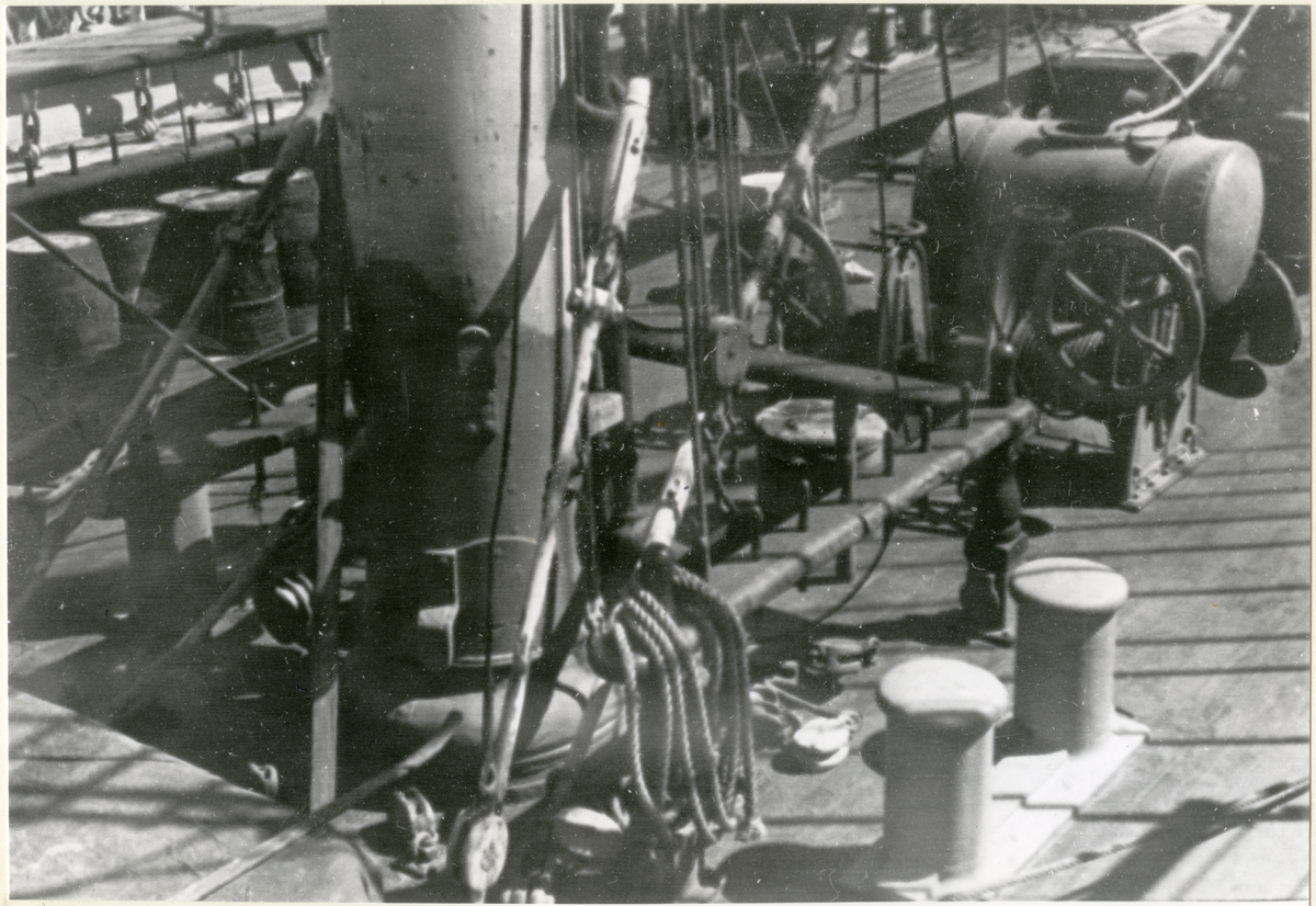 [från fotobeskrivningen:] "4-mast barken PASSAT av Mariehamn. Däcksbild taget från backen [sic]. Foto 1944." [---]