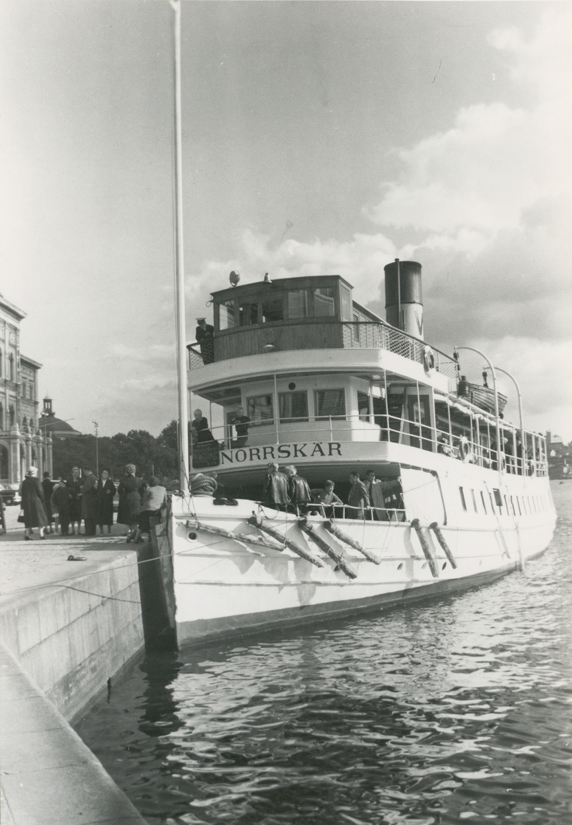 Passagerarångfartyget Norrskär av Vaxholm liggande vid Nybrokajen omkring 1955.