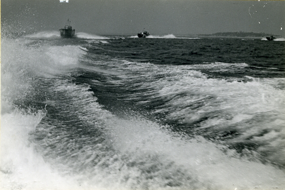 Motortorpedbåtar i full fart i skärgården.