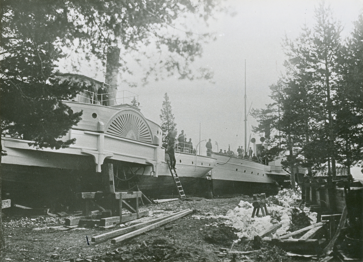 Foto i svartvitt vidande hjulångfartygen CARL XV t.v. och ODIN t.h. på slipen i Minnesgärde år 1903.
