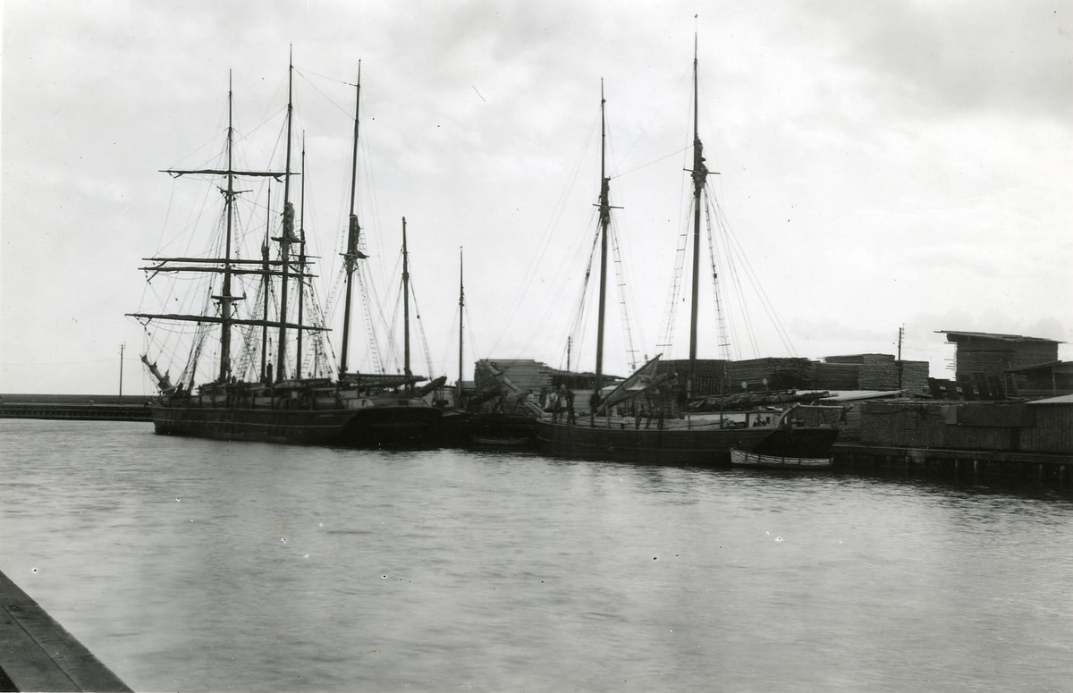 Segelfartyg, 2-mastade och 3-mastade skonare, lastar virke i Kalmar hamn 1916.