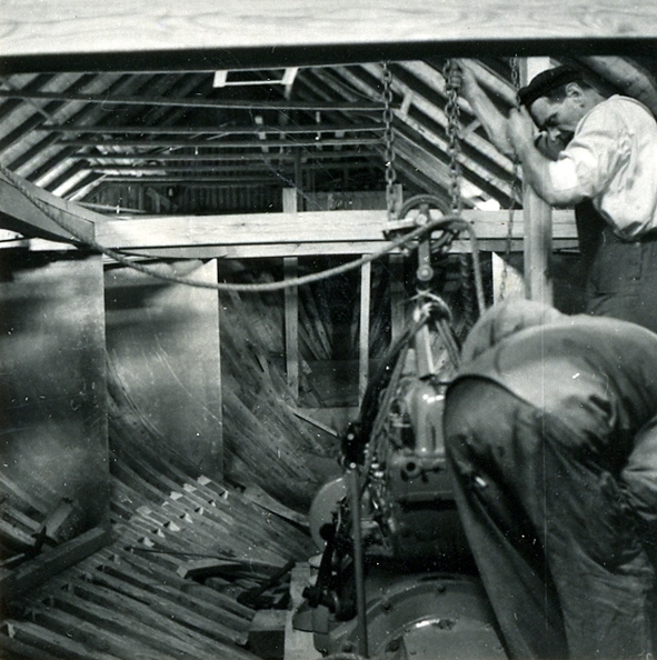 Lunds skeppsvarv.Lotsbåt under byggnad. Skrovinteriör med spant- och däcksbalkar samt förstärkningsskott av aluminiumplåt.