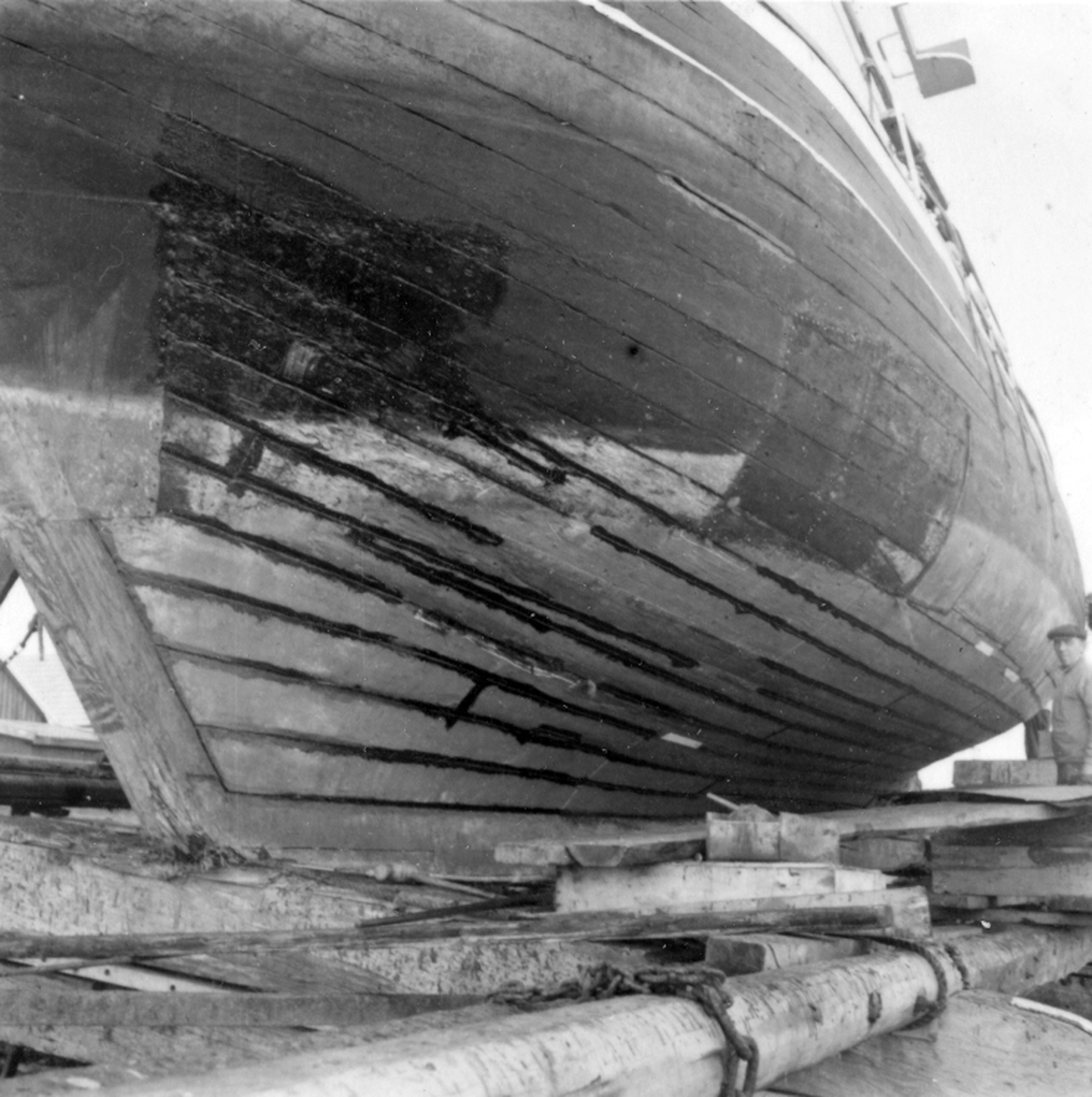 Titel: Fredrik Johanssons varv. Jakten Vega av Degerhamn, byggd i Bergkvara 1909. På slip för drivning. Skrovet sett underifrån.