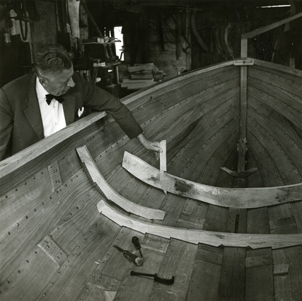 Lynaes-jollens förskepp. Olof Hasslöf håller ett "lodd" så som det användes när man "sticker till" en bottenstock. Christian Madsens båtbyggeri. Foto N(ils) Nilsson aug (19)64. Danmark, Själland, Lynaes.