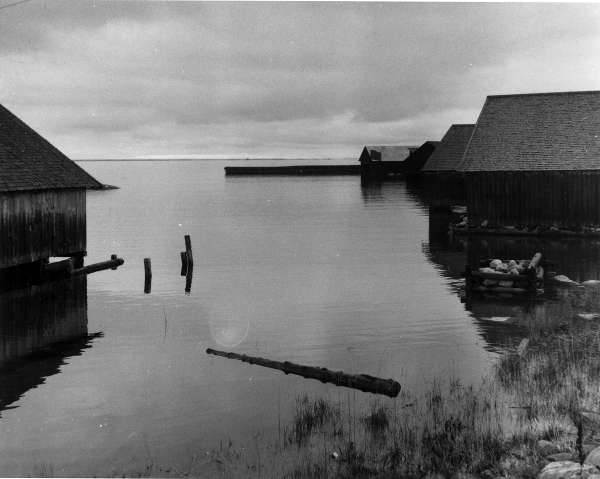Norrboda hamn med vågbrytare och sjöbodar, okt 1954.