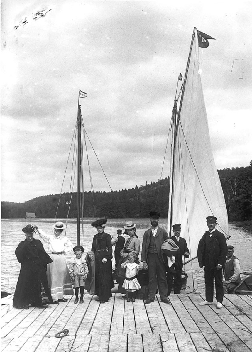 Sällskap på bryggan. Från vänster: Carolina Carlsson (mor till Karl Fredrik), Ebba Wislander (syster till Karl Fredrik) , pojken Idus Carlsson (son till Knut Carlsson), Adele Lundberg (hushållerska hos Carolina Carlsson), Ingeborg Häggblom (syster till Karl Fredrik), flickan Astrid Häggblom, Häggblom (journalist Stockholms Dagblad), Ernst Carlsson (bror till Karl Fredrik) samt Karl Fredrik Carlsson.