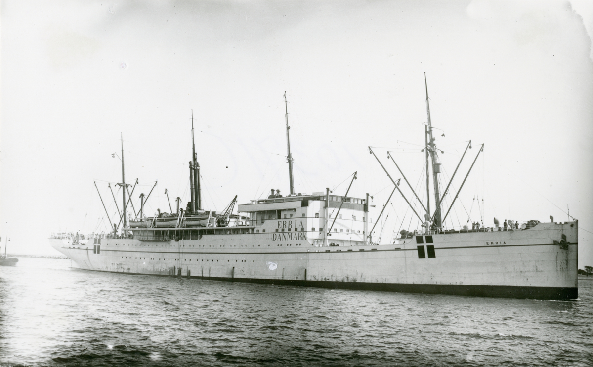 Foto i svartvitt visande passagerarmotorfartyg ERRIA av Köpenhamn i Köpenhamn under 1939-1940-talet.