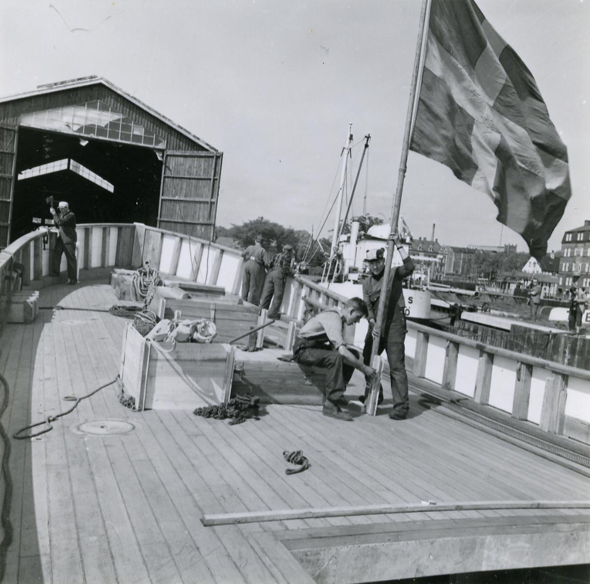 Flaggan hissas. Ankartrossarna passas när de löper ut.