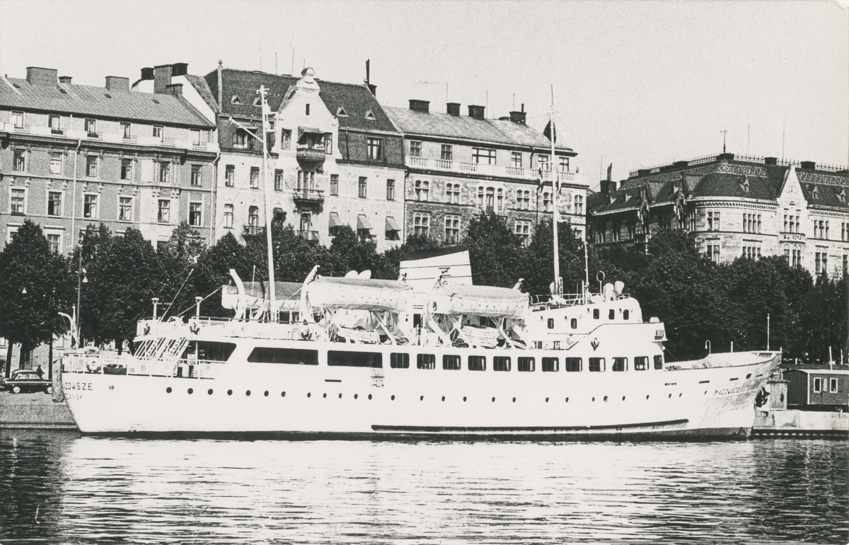Foto visande passagerarfartyget Mazowsze vid Strandvägen i Stockholm, 1958