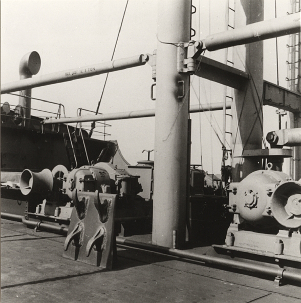 Lastfartyget m/s FENRIS. Sam Svenssons arbetsfoton för modellbygge. Fockmastens nedre del och vinschar på däck.