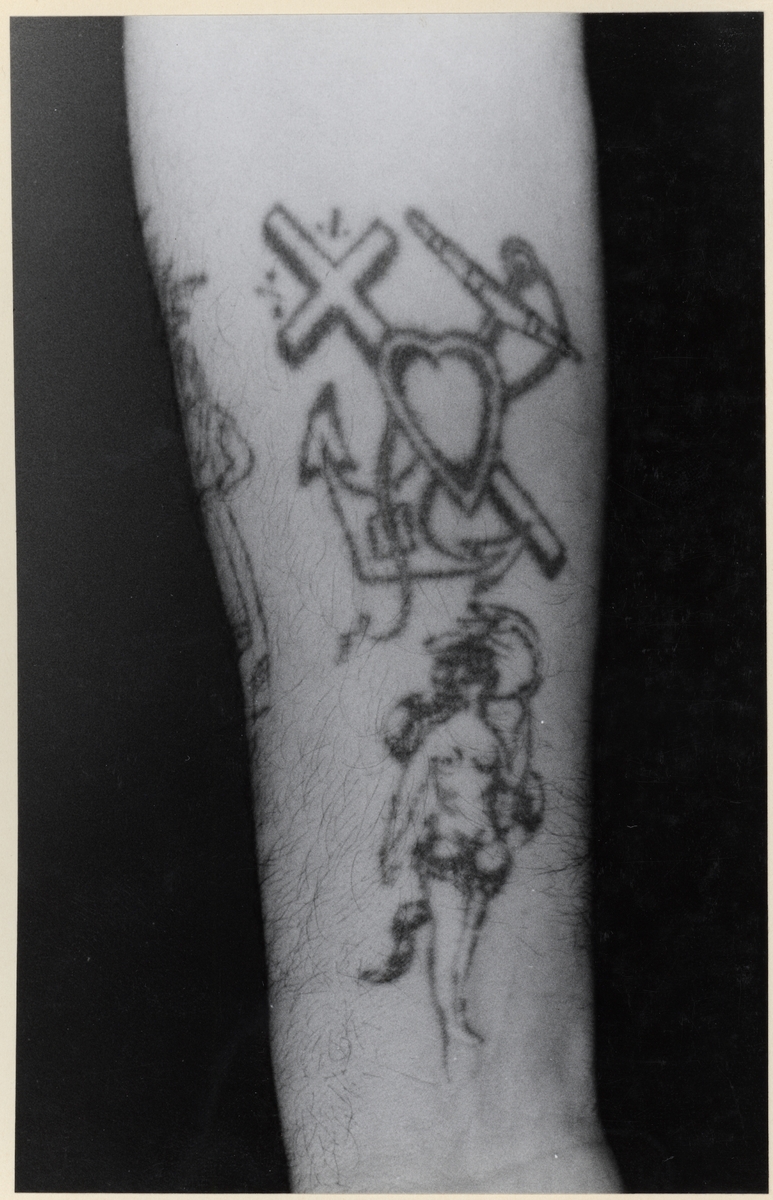 Tatueringar på höger underarm: "Tro, hopp och kärlek" utfört i London 1904 av en norrman vid namn Martin. Hjärtat är rött. Flickan och ormen är utförda i Stettin.
