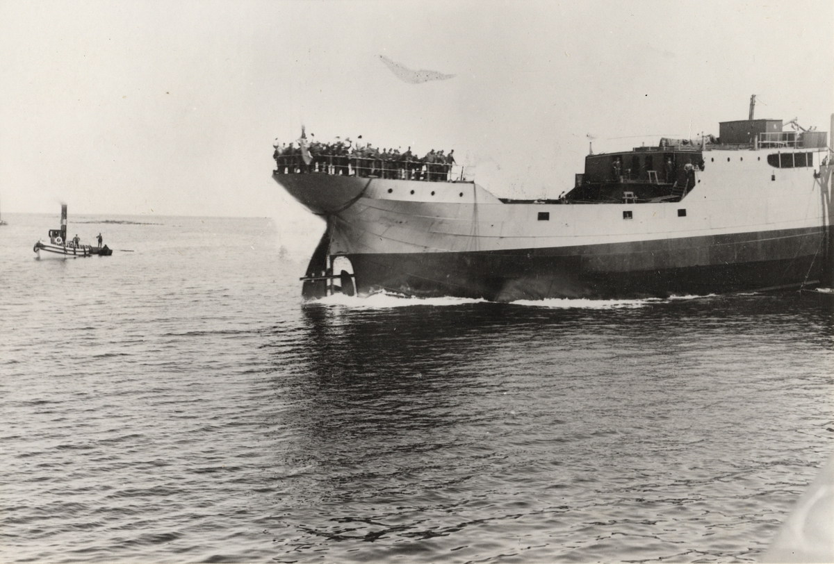 Sjösättningen av lastångfartyget OSCARSBORG. Byggnr. 245. Till vänster på bilden syns bogserbåten ISBJÖRN.