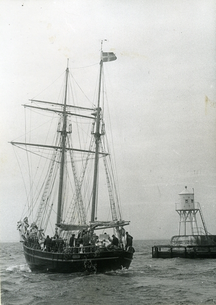Holms skeppsvarv. Skonaren Wetsera, från Tyresö, (och) som blivit ombyggd till lustfartyg går ut på provtur 1961. Skåne, Malmöhus län, Råå.