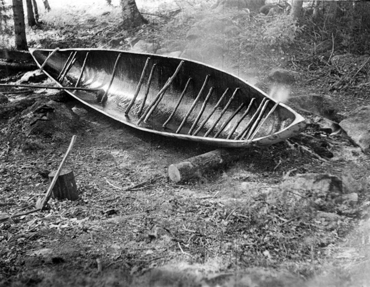 Äspingen är utspänd. Inne i båten synes de olika långa stöttorna. Gåva av Institutet för folklivsforskning 1953. tryckt i Folk-Liv 1947